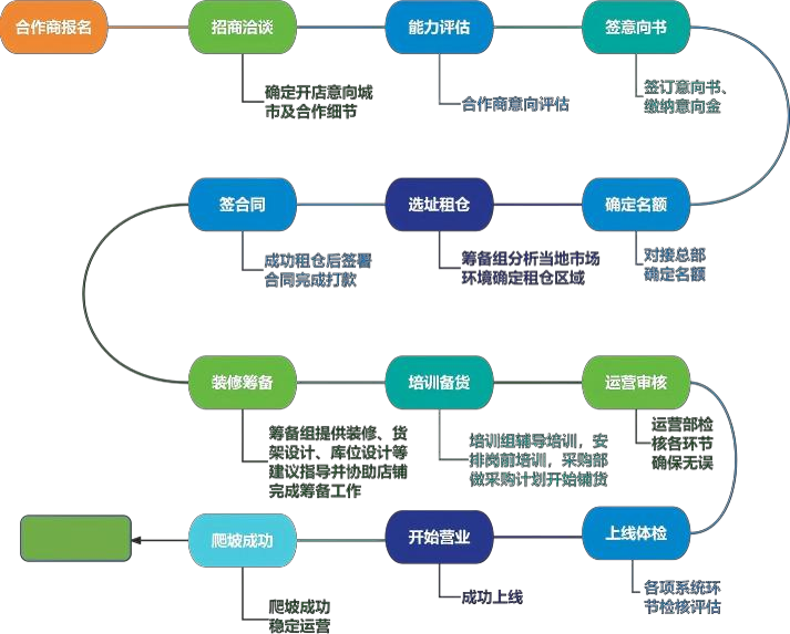 首先是前期对接,由合作商提交报名意向后,双方通过招商洽谈明确开店城市与细节,再经品牌方的能力评估确认合作可行性;随后进入签约锁定阶段,双方签订意向书并缴纳意向金锁定资格,同时对接总部确定门店名额;接着是落地筹备,合作商完成选址租仓后签订正式合同并付款,品牌方协助完成装修筹备,同步开展培训与备货工作;最后进入运营启动阶段,门店通过系统上线体检后正式营业,经品牌方运营审核确认合规后,完成运营磨合并进入稳定经营状态,即达成爬坡成功。